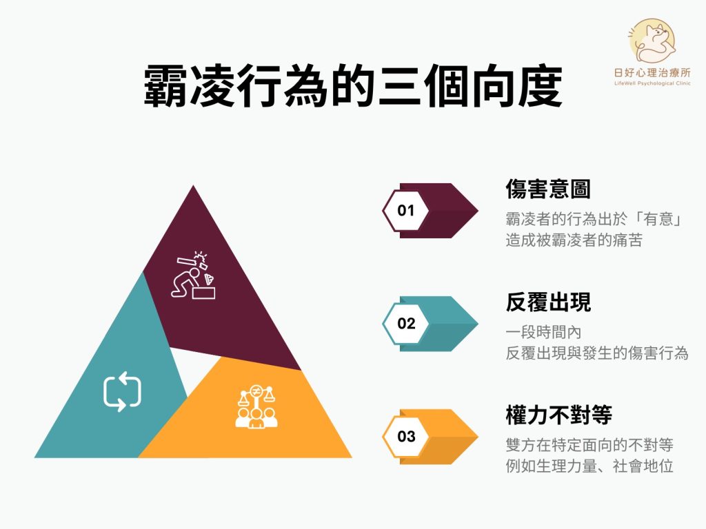 霸凌是一種不對等的權力關係,並且具有傷害意圖、反覆發生攻擊行為的特性。相關徵兆例如身上出現不明傷痕、財務毀損(例如:衣服、文具)、經常說身體不舒服(例如:頭痛、肚子痛等)、變得退縮、孤獨、朋友突然變少、缺乏自信心等等。