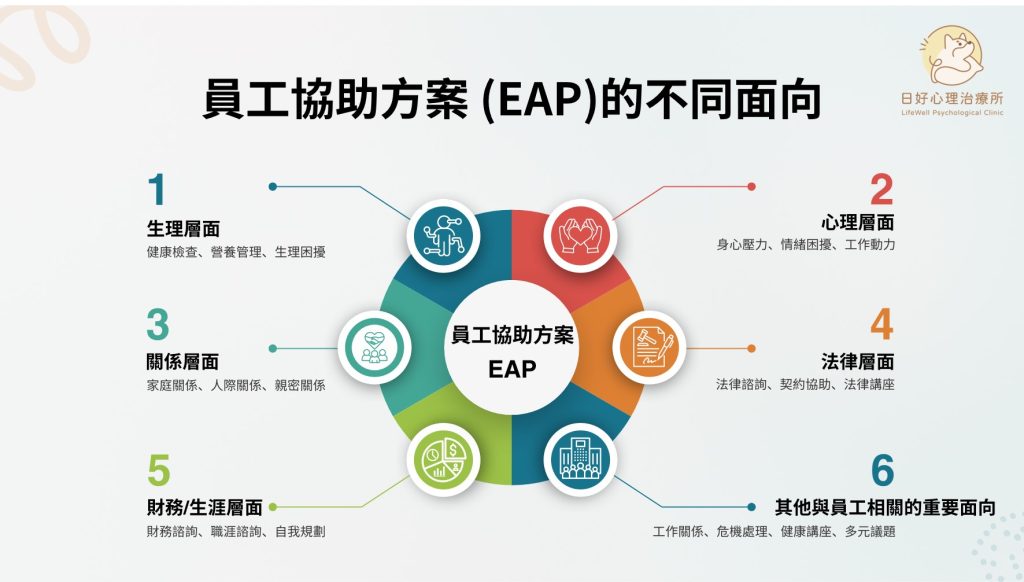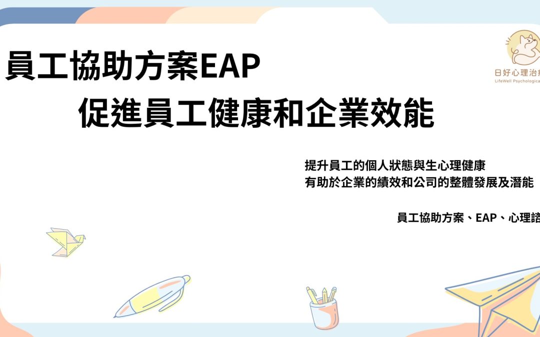 EAP是一種基於職場和工作的介入計劃,其目標在於幫助企業內的員工處理和解決可能影響工作效能的個人議題。包含工作方面(適應、發展、規劃)、生活方面(法律、財務)、健康方面(生理健康、心理健康)等層次。